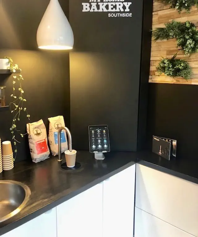 (My Home Bakery) My Home Bakery select TopBrewer with dual-milk fridge to serve premium coffee with non-dairy drink options.