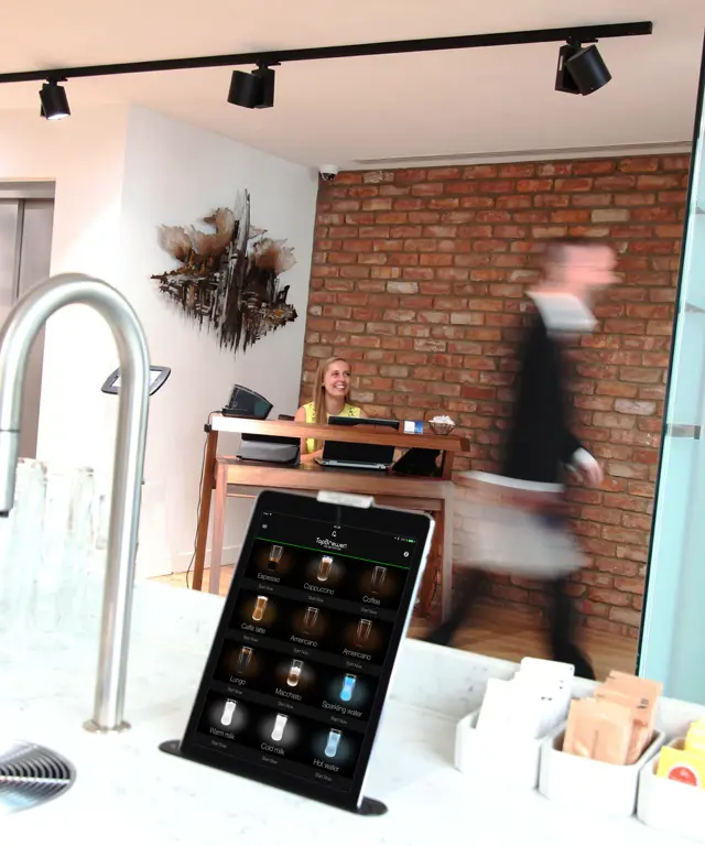 Staff and visitors make drinks to their exact requirements through the iPad set into the worktop or through the app on their phone.