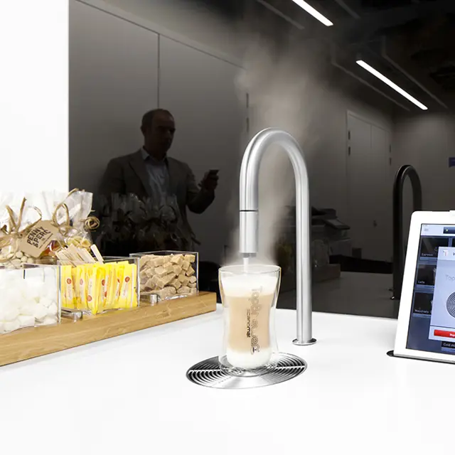 Members can individually customise their drinks using the TopBrewer app. The minimal swan neck tap design and silent brewer, which uniquely resides under the counter, means that it complements the modern open plan workspace in a subtle way.