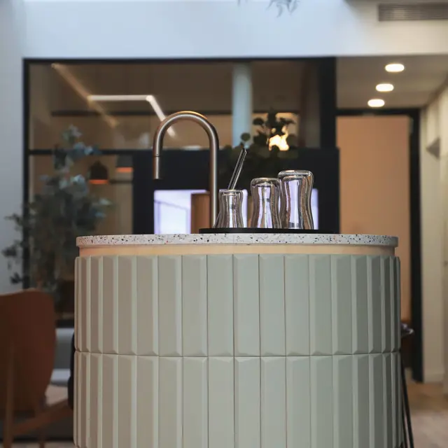 Dans ce showroom nous voulions créer un comptoir café inspiré des codes de l’hôtellerie de luxe pour offrir une expérience inoubliable à nos clients.