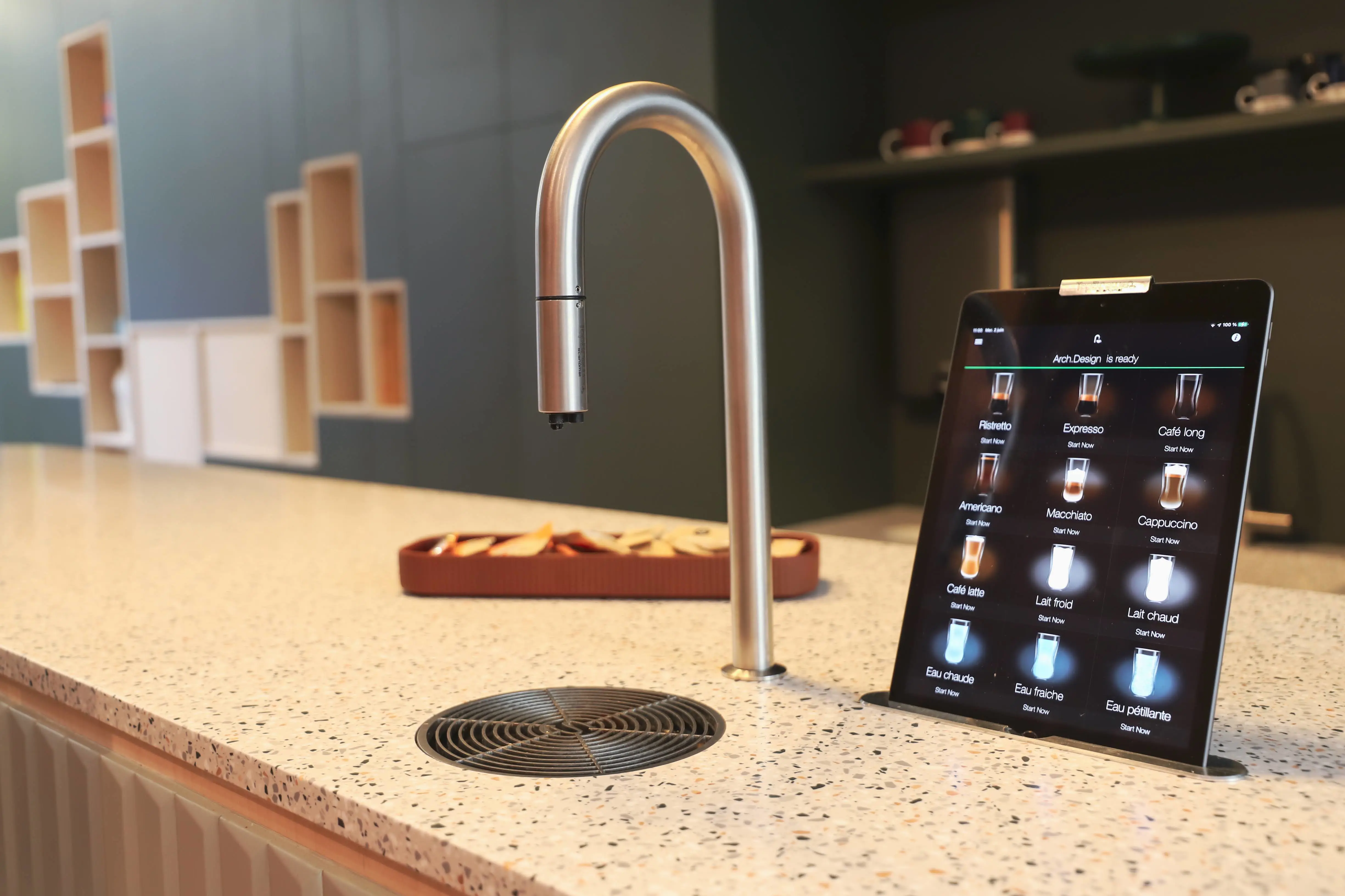 Avec 99 % de l’équipement technique encastré, TopBrewer révolutionne l’aménagement des espaces détente. La flexibilité de conception a permis aux architectes de ce lieu de créer un îlot central en résine synthétique où rien n’obstrue l’esprit de sophistication.