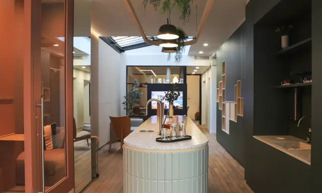 Une expérience haut de gamme commence par un lieu à l’ambiance feutrée. Avec son esthétique inspirée des codes de l’hôtellerie de luxe, l’espace a été conçu dans le souci du moindre détail. La verrière haussmannienne a été conservée pour apporter de la lumière naturelle dans le coin détente. L’esprit lounge se retrouve dans le choix de matériaux nobles et de couleurs sobres.