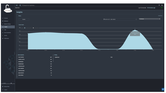 Otrzymuj raporty z czyszczenia, raporty o błędach i raporty dotyczące spożycia kawy. Zobacz dokładnie, co jest spożywane i kiedy. Zmniejsz ilość odpadów i miej pewność, że zawsze masz świeże ziarna kawy.