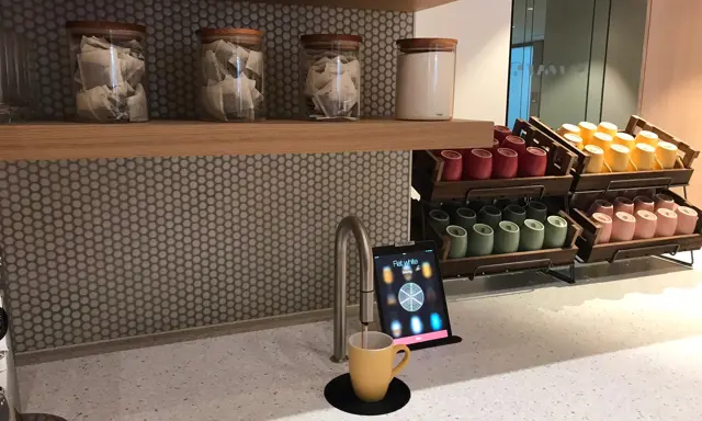 Staff and visitors make drinks to their exact requirements through the iPad set into the worktop or through the app on their phone.