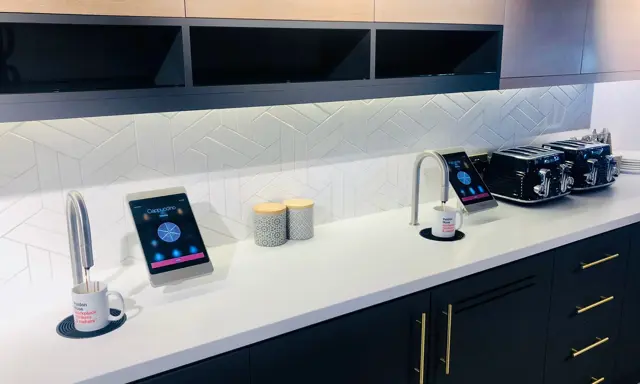 Staff and visitors make drinks to their exact requirements through the iPad set into the worktop or through the app on their phone.